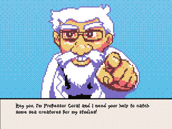 You control a small submersible that can stun and catch fish with sonic waves emitted by a speaker. Catch the fish in a specific order. Professor Coral will give you a hint on which fish to catch next in the upper left panel!